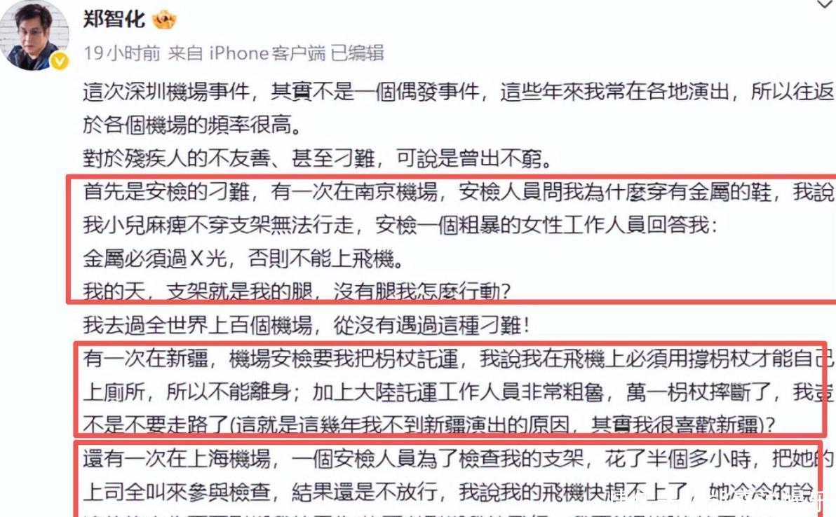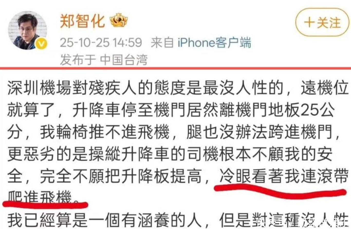 事情起因,是他在社交平台怒斥深圳机场“没人性”。他说,自己坐轮椅乘机时因为升降设备不匹配,被迫连滚带爬进飞机,工作人员全程冷眼旁观。他一番字字泣血的描述,很快引发网络大面积同情,机场也火速道歉并承诺整改。看起来,郑智化像是受了天大的委屈。