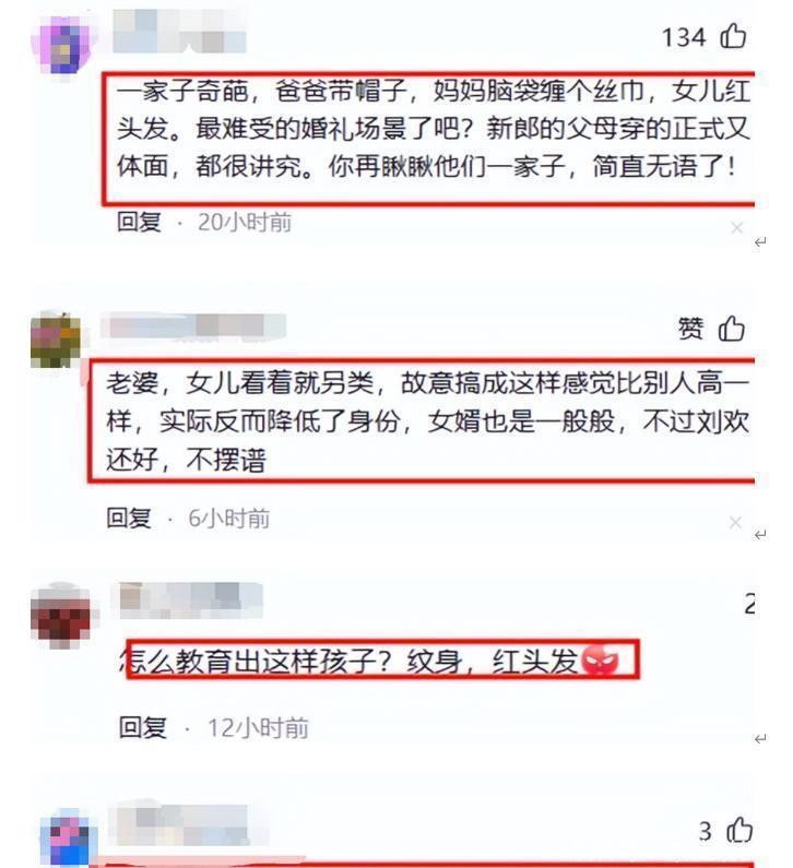 可这次刘欢的女儿刘一丝大婚,却变成了网友“批斗大会”的现场。从喜宴用茅台,到刘欢穿得太素、卢璐头戴丝巾、女儿染红发穿红裙,再到新郎长相不帅。几乎每一个细节都被放大解读,甚至有人说他们“一家打扮不体面”、“新郎长得贼眉鼠眼”。